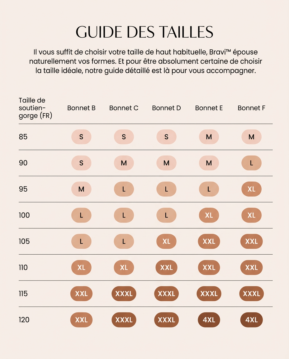 Il suffit de choisir votre taille de haut habituelle, le Bravi™ s'adaptera instantanément à votre corps.